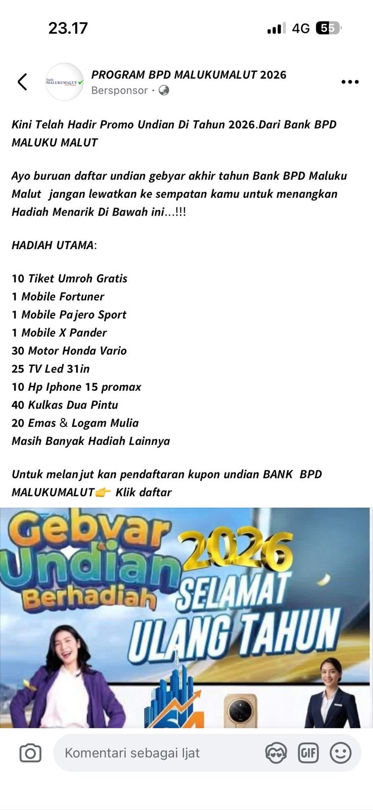 Sebelumnya, informasi undian tersebut diunggah akun facebook Program BPD Maluku-Malut 2026 yang menawarkan promo undian berhadiah sebagai berikut: